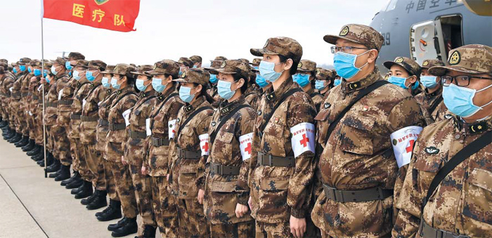 中, 확진자 폭증 우한에 대규모 軍 투입 - 중국 후베이성 우한의 신종 코로나 바이러스 감염병 환자들을 치료하고 지원하기 위한 군 병력이 13일 우한 톈허 국제공항에 도착해 도열해 있다. 시진핑 중국 국가주석은 이날 오전 육해공군을 비롯 전략지원부대, 로켓부대 등에서 의료진 2600여명을 추가 차출해 파견할 것을 지시했다고 중국 신화통신은 보도했다. 당초 중국 정부는 군 의료진 4000여명을 우한에 파견키로 했으나 환자가 폭증하자 군 투입 규모를 대폭 늘렸다. /신화 연합뉴스